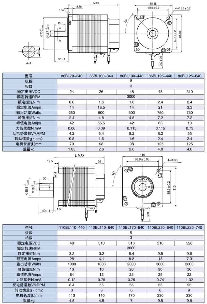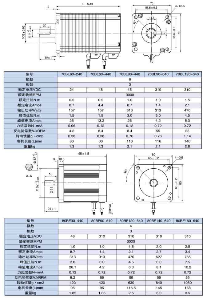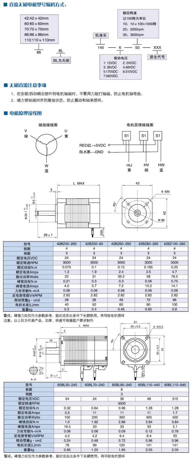 無刷電機采用了4極和8極轉子設計,機型號有42、57、60、70、80861100.1Nm6Nm的連續轉矩;高性能釹鐵硼磁鋼提供3倍以上的峰值扭矩。